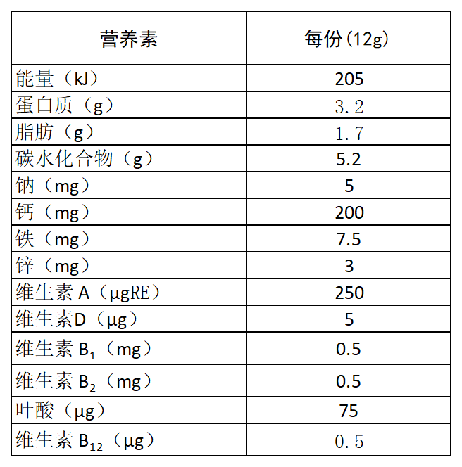 配料表:速溶豆粉(大豆、麥芽糖、碳酸鈣、碳酸氫鈉)、乙二胺四乙酸鐵鈉、富馬酸亞鐵、葡萄糖酸鋅、維生素A(醋酸視黃酯)、維生素D3、維生素B1(鹽酸硫胺素)、維生素B2(核黃素)、葉酸、維生素B12(氰鈷胺)。