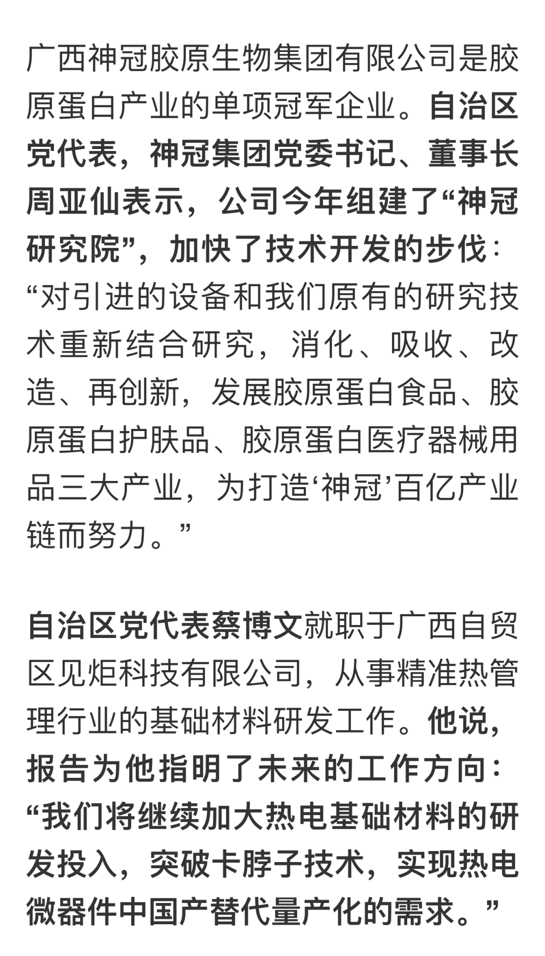 近日,廣西壯族自治區(qū)第十二次黨代會開幕,膠源秀所屬神冠集團(tuán)黨委書記、董事長周亞仙,在會議上發(fā)表了相關(guān)講話。